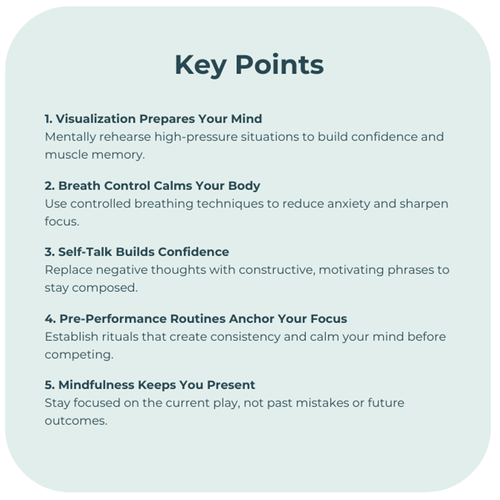 This strategy is simple by design—but don’t confuse simple with easy. When used correctly, it sharpens focus, reduces anxiety, and anchors athletes firmly in the present moment.